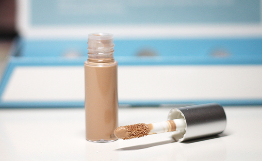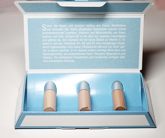 Kommen mir nun zu dem Produkt, das bei mir eher das Gegenteil von Begeisterung auslöst. Ich kenne von Nutraskin schon ein sehr ähnliches Produkt – in einer früheren Glossybox war ein 3er-Set Concealer zum Selbermischen enthalten. Tatsache ist, dass ich das tägliche Zusammenmischen viel zu umständlich finde und daher die Concealer ein, zwei mal einfach so aus dem Fläschchen angewendet habe. Im Endeffekt sind sie aber für mich nicht überzeugend gewesen, weshalb die Minifläschchen noch immer bei mir herumkugeln.