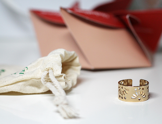 Das erste von zwei Lifestyle-Produkten in der April-Ausgabe der My Little Box ist ein kleiner, goldfarbener Ring. Er ist etwa einen Zentimeter breit und unten offen, sodass die Größe einfach auf die Stärke des gewünschten Fingers eingestellt werden kann. Das eingestanzte Blütenornament lässt den Ring sehr hübsch und zart wirken. Ich habe zwar keine große Hoffnung, dass die goldene Farbe sehr lange halten wird, doch zumindest für eine kurze Zeit hat man so einen wirklich hübschen Ring. Mir gefällt er gut!